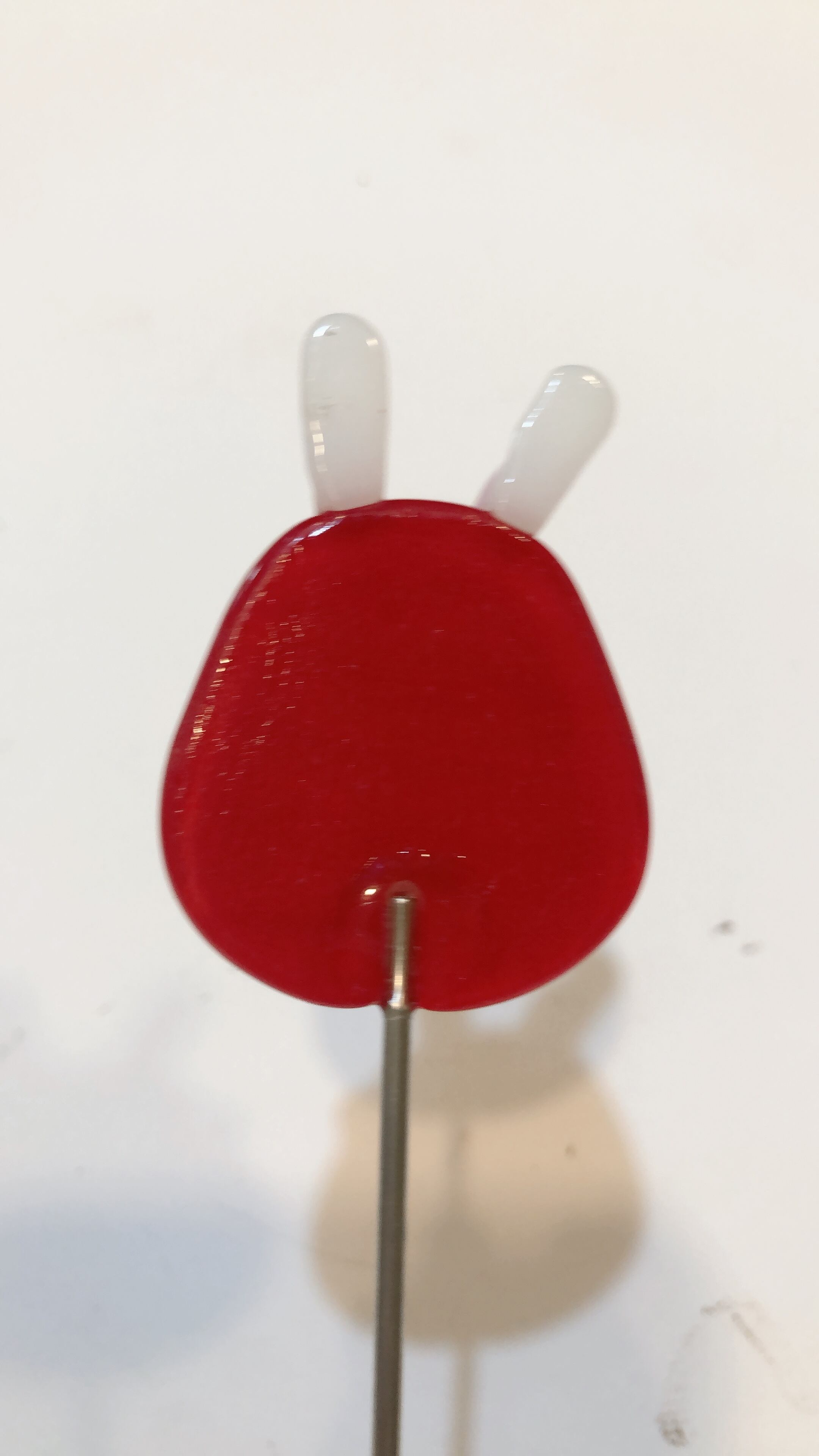 電気炉でクリアのガラスと色ガラスを重ねて一度焼いた後で目など 細かいパーツを付けたり描いたりしてから 2度目の燃焼をして本体を完成させています